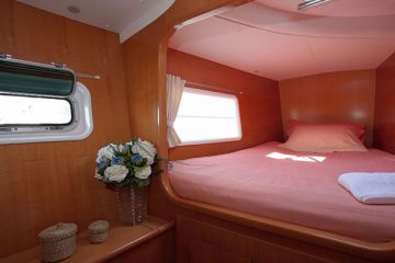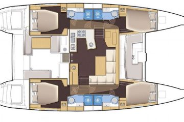 El interior lujoso y amplio, con sus 4 camarotes con baño propio hacen de este barco las delicias de los que buscan disfrutar de unas vacaciones inolvidables con su grupo de amigos o familia.